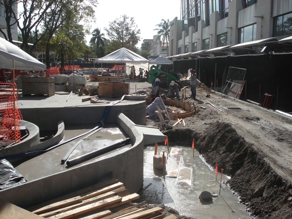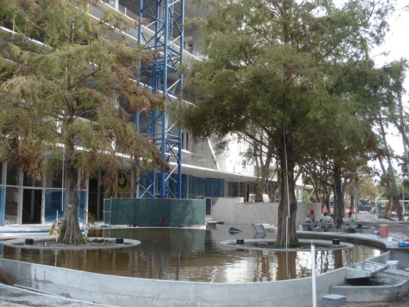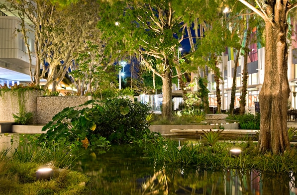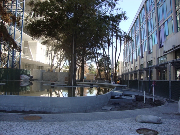 In places such as Miami Beach, Florida, where every last square foot of land is precious, renovation and revitalization work is constant, including at 1111 Lincoln Road, which Raymond Jungles, Inc. recently came along to transform from a dull roadway into a tree- and pond-lined walkway. Raymond Jungles himself oversaw the project, which had to conform to both his client’s original vision for an outdoor commercial district and the stipulations of the Miami Beach Historical Preservation Board, but he made sure his own plans—to bring back a bit of natural Florida habitat for area wildlife—were also met. The first step involved stripping away the roadway’s original concrete and central median, and then new polished-concrete planters were installed in various configurations to conform to the shapes of surrounding structures. Jungles also installed a recirculating pump system to supply four biofiltrated water-gardens built into the system of planters, and then the walkway itself was laid over with a mosaic of Pedra Portuguesa pavement. 1111 Lincoln Road is located between two taller structures that minimize sunlight, so Jungles opted to plant semi-deciduous live oaks and cypresses that would allow sunlight in winter and provide shade in summer. On the site’s south side, a high water table presented a final challenge, but Jungles negotiated it by planting salt-tolerant Sabal palms and Pachira aquatica. The resulting walkway is a vibrant public space traversed daily by hundreds, who, if they look closely, will hopefully notice the bromeliads and epiphytes Jungles tied to the limbs of trees even after the project was finished. ABQ