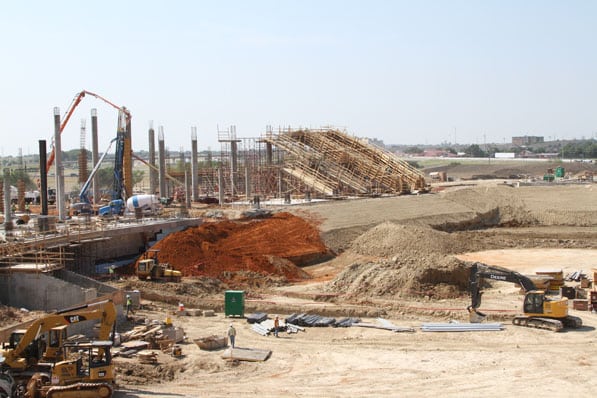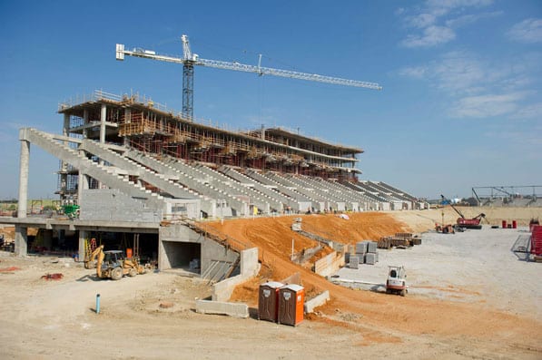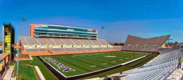Looking out over a flat expanse of Texas prairie land, the University of North Texas’s (UNT) Apogee Stadium is a structure of tremendous scope, both in its size and its sustainability. Manhattan Construction Company (MCC) broke ground on the 31,000-seat stadium, designed by HKS, on Nov. 21, 2009, aiming to replace UNT’s old stadium, Fout’s Field, with a new facility in time for the 2011 football season. The firm first brought in a number of earthmovers to clear the land for construction, and then it got to work putting up the stands around the field by building a steel-reinforced concrete skeleton and outfitting it with metal seating, fencing, and railings. Steamrollers flattened out the center of the stadium bowl before the artificial turf was installed, and toward the end of construction, substantial amounts of glass and brick were incorporated into the press box and luxury-suite structure behind the home-team stands. MCC also oversaw the installation of an energy-efficient HVAC system and low-flow sinks and toilets, and the firm diverted at least 75 percent of the construction materials from the landfill, all of which helped the facility ultimately earn LEED Platinum certification, making it the first collegiate stadium in the United States to do so. In December of 2011, the students of UNT also watched as three wind turbines were built and connected to Apogee Stadium and the electrical grid. It’s estimated that the turbines will generate about 500,000 kilowatt hours of power, supplying the field with substantial renewable energy and preventing roughly 323 metric tons of CO2 from being released into the air. ABQ