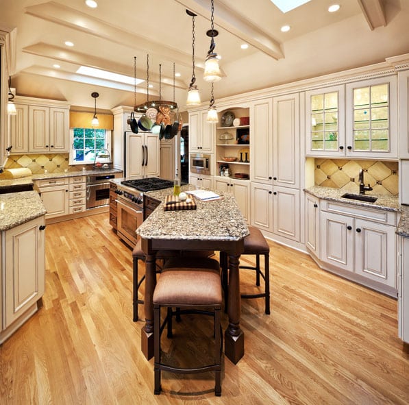 The firm’s latest work on the house came in 2010, when it turned a small 1980s kitchen into a French country delight. ALH created a vaulted, coffered ceiling that added a full foot and eight inches to the room’s height, which “allowed us to substantially increase the lighting by adding two skylights,” Harris says. ALH also added five false beams to match the hearth room and tie the two spaces together. LED lighting was hidden inside glass cabinets, and ALH also installed recessed lighting and onyx pendant lights over the windows and island.