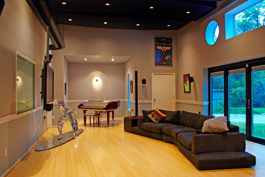 2. The room’s multipurpose functionality allows owner David Ronn to use it not only as a professional home-recording studio and rehearsal space but also as a living room, entertainment room, and home theater.
