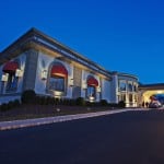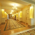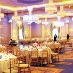 A large contemporary glass chandelier hangs in the middle of the lobby—programmed with LED lights that flash interchangeable colors. Two ballrooms are connected on opposite sides of the space—one the 4,500-square-foot Regency, the other the 10,600-square-foot Grand—and along their walls are pilasters, which feature contemporary acrylic capitals with LED lights. The ballrooms also have crystal chandeliers and custom carpeting with rich color.