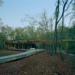 The 100-acre peninsula located next door to the Indianapolis Museum of Art hadn’t been touched since the 1950s—deemed unsuitable for construction and overrun with woodlands. In 2006, though, the museum hired Arkansas-based architecture firm Marlon Blackwell Architect (MBA) and Ed Blake of Landscape Studio (based in Hattiesburg, Mississippi) to explore the possibility of using the lot as a nature park and to investigate whether or not the space would be suitable for construction. The firms’ findings weren’t exactly favorable. “Of the 100 acres in the park, only two-thirds of an acre supported putting a building on it,” MBA project manager Jonathan Boelkins says.