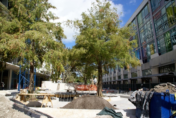 In places such as Miami Beach, Florida, where every last square foot of land is precious, renovation and revitalization work is constant, including at 1111 Lincoln Road, which Raymond Jungles, Inc. recently came along to transform from a dull roadway into a tree- and pond-lined walkway. Raymond Jungles himself oversaw the project, which had to conform to both his client’s original vision for an outdoor commercial district and the stipulations of the Miami Beach Historical Preservation Board, but he made sure his own plans—to bring back a bit of natural Florida habitat for area wildlife—were also met. The first step involved stripping away the roadway’s original concrete and central median, and then new polished-concrete planters were installed in various configurations to conform to the shapes of surrounding structures. Jungles also installed a recirculating pump system to supply four biofiltrated water-gardens built into the system of planters, and then the walkway itself was laid over with a mosaic of Pedra Portuguesa pavement. 1111 Lincoln Road is located between two taller structures that minimize sunlight, so Jungles opted to plant semi-deciduous live oaks and cypresses that would allow sunlight in winter and provide shade in summer. On the site’s south side, a high water table presented a final challenge, but Jungles negotiated it by planting salt-tolerant Sabal palms and Pachira aquatica. The resulting walkway is a vibrant public space traversed daily by hundreds, who, if they look closely, will hopefully notice the bromeliads and epiphytes Jungles tied to the limbs of trees even after the project was finished. ABQ