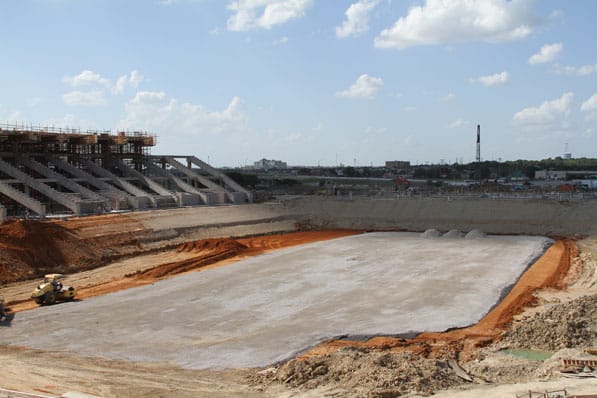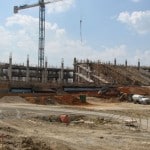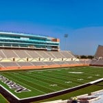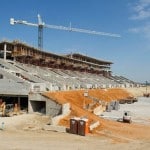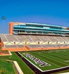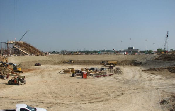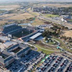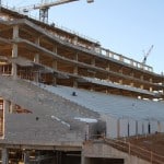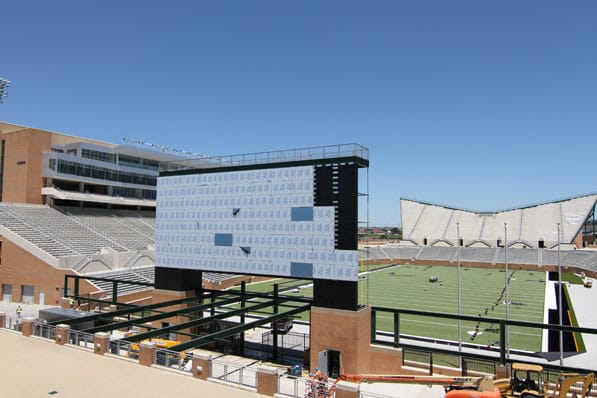 Looking out over a flat expanse of Texas prairie land, the University of North Texas’s (UNT) Apogee Stadium is a structure of tremendous scope, both in its size and its sustainability. Manhattan Construction Company (MCC) broke ground on the 31,000-seat stadium, designed by HKS, on Nov. 21, 2009, aiming to replace UNT’s old stadium, Fout’s Field, with a new facility in time for the 2011 football season. The firm first brought in a number of earthmovers to clear the land for construction, and then it got to work putting up the stands around the field by building a steel-reinforced concrete skeleton and outfitting it with metal seating, fencing, and railings. Steamrollers flattened out the center of the stadium bowl before the artificial turf was installed, and toward the end of construction, substantial amounts of glass and brick were incorporated into the press box and luxury-suite structure behind the home-team stands. MCC also oversaw the installation of an energy-efficient HVAC system and low-flow sinks and toilets, and the firm diverted at least 75 percent of the construction materials from the landfill, all of which helped the facility ultimately earn LEED Platinum certification, making it the first collegiate stadium in the United States to do so. In December of 2011, the students of UNT also watched as three wind turbines were built and connected to Apogee Stadium and the electrical grid. It’s estimated that the turbines will generate about 500,000 kilowatt hours of power, supplying the field with substantial renewable energy and preventing roughly 323 metric tons of CO2 from being released into the air. ABQ