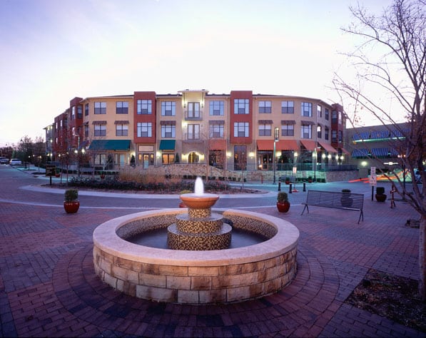 Along with residential units and retail space, the development includes 11,500 square feet of office space and structured parking. The site plan is meant to maximize daytime customer traffic—to the retail establishments, the library, and the community center—and evening traffic as residents return home to patronize restaurants and shops located near each other in the walkable town center.
