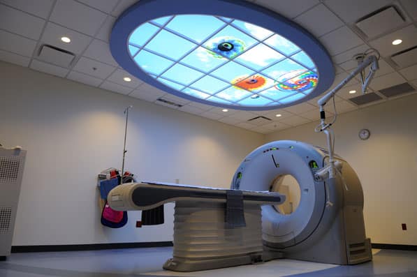 At the Kosair Children’s Medical Center, even the building itself is a positive diversion. “We really had the opportunity to think about [whom] we were serving,” system director of facility planning and construction management David Boome says. “We turned the architects loose.” Some ideas—such as putting a roller coaster on the building’s exterior—were obvious no-gos, but the designers still incorporated curving shapes and bright colors around the building envelope to create a more fanciful impression. The facility also includes a dedicated play space for siblings in the emergency-department family area, and there’s original artwork in the hallways, some of which was created by young adults.