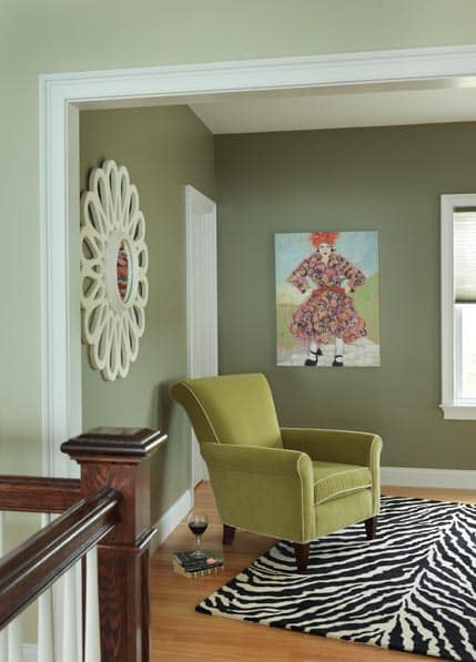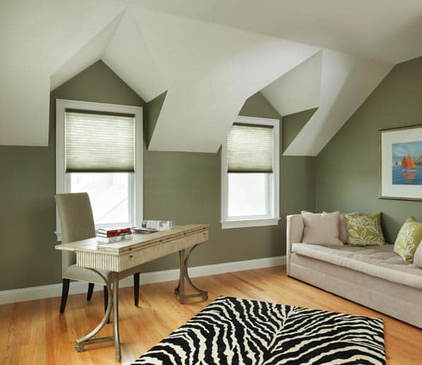 Much like the exterior, the interior of the home is washed in muted grays and eggshell whites. One exception is the subtly green wallpaper in the guest room, which is playfully juxtaposed with a zebra-print rug in the center of the floor, and window cutouts in the room’s angled ceiling enhance its unique look and encourage creative spacial planning. The kitchen is painted in brighter colors, with a granite countertop island in the center offering seating for three. Dark wooden cabinets, some with translucent windows, contrast pleasantly with the light wooden floor, and the seating area adjacent to the kitchen functions as a contemplative social space.