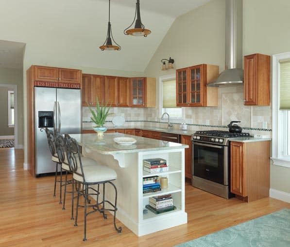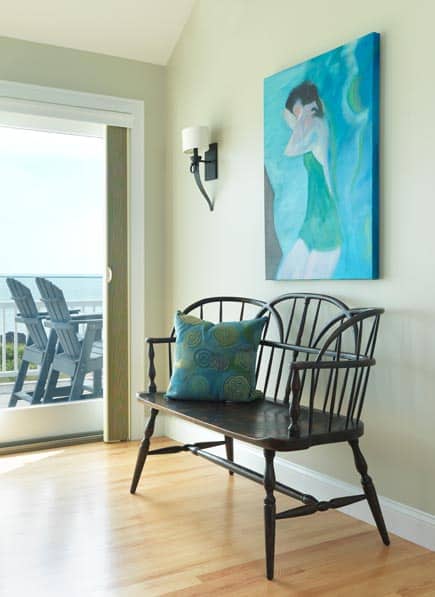 Designed and remodeled by Davitt Design Build, a 31-year-old, 18-person architectural construction firm headquartered in nearby West Kingston, the home features light-gray wooden siding on the exterior, and the roofs and eaves are finished with a decorative crown molding that lends a subtle air of antiquity and elegance. Davitt included circular port windows under the gables as a nod to Colonial and maritime styles, but they simultaneously function to introduce additional natural light into the home, creating a space that is as warm as it is welcoming. Seeing it now, one would never guess the size of the original house it was built from.